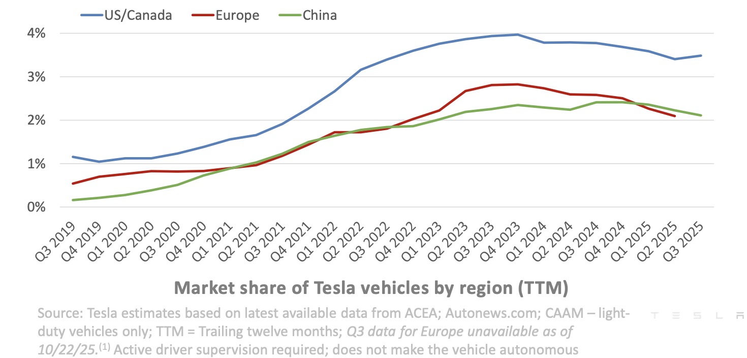 Savo 2025 m. trečiojo ketvirčio atnaujinime „Tesla“ įtraukė diagramą, kurioje parodyta jos rinkos dalis pagal regionus, ir joje matyti, kad „Tesla“ rinkos dalis Europoje ir Kinijoje 2025 m. buvo mažesnė, palyginti su ankstesniu piku.