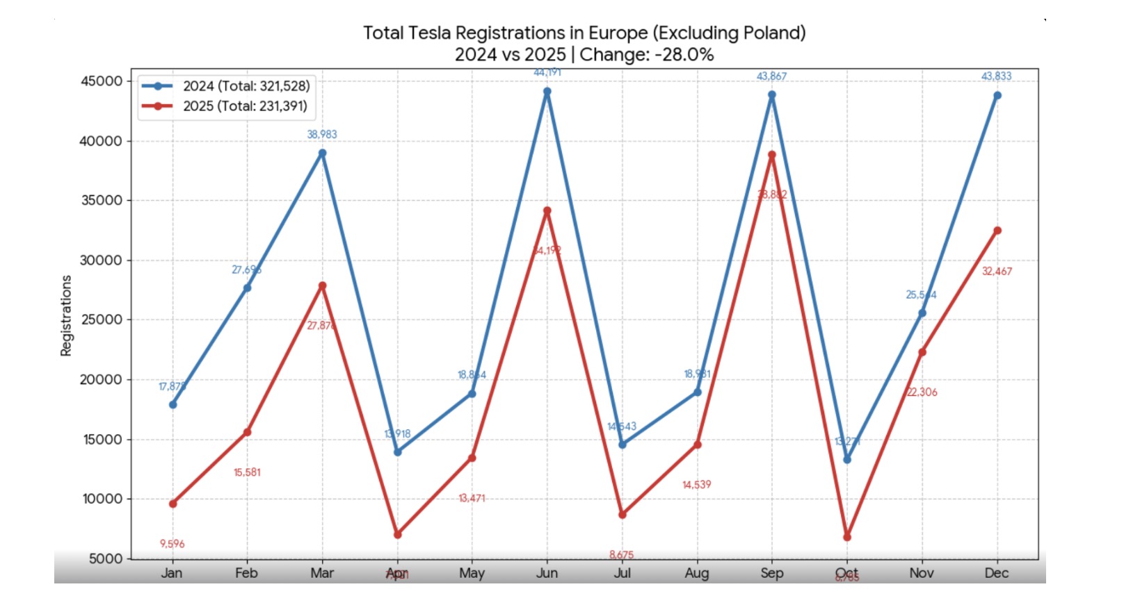 Remiantis mėnesiniais registracijos duomenimis keliose Europos rinkose (išskyrus Lenkiją), „Tesla“ pardavimai sumažėjo apie 28 % .