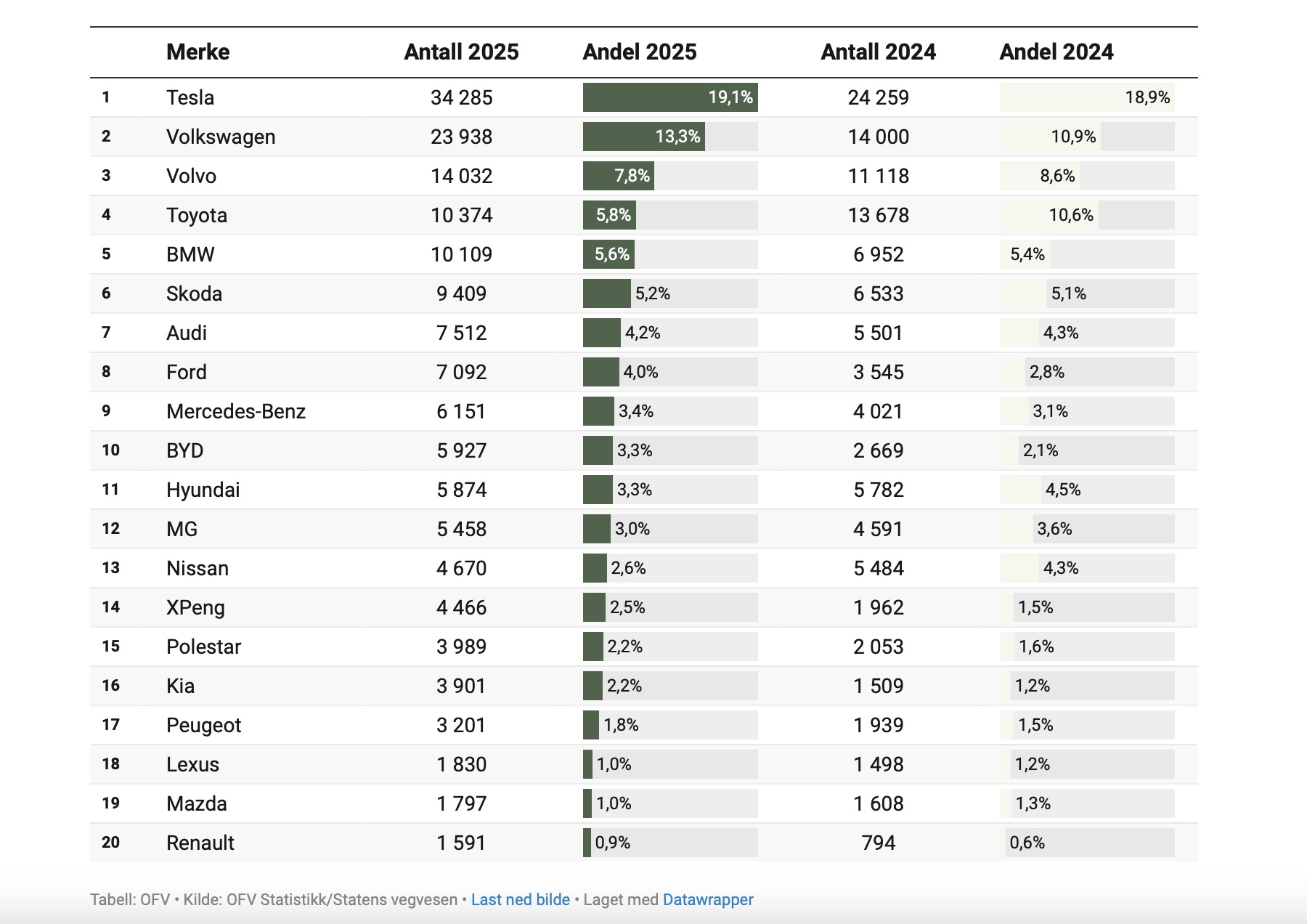 Žemiau galite pamatyti geriausiai parduodamus automobilių prekės ženklus Norvegijoje 2025 m., o „Tesla“ užima pirmąją vietą.